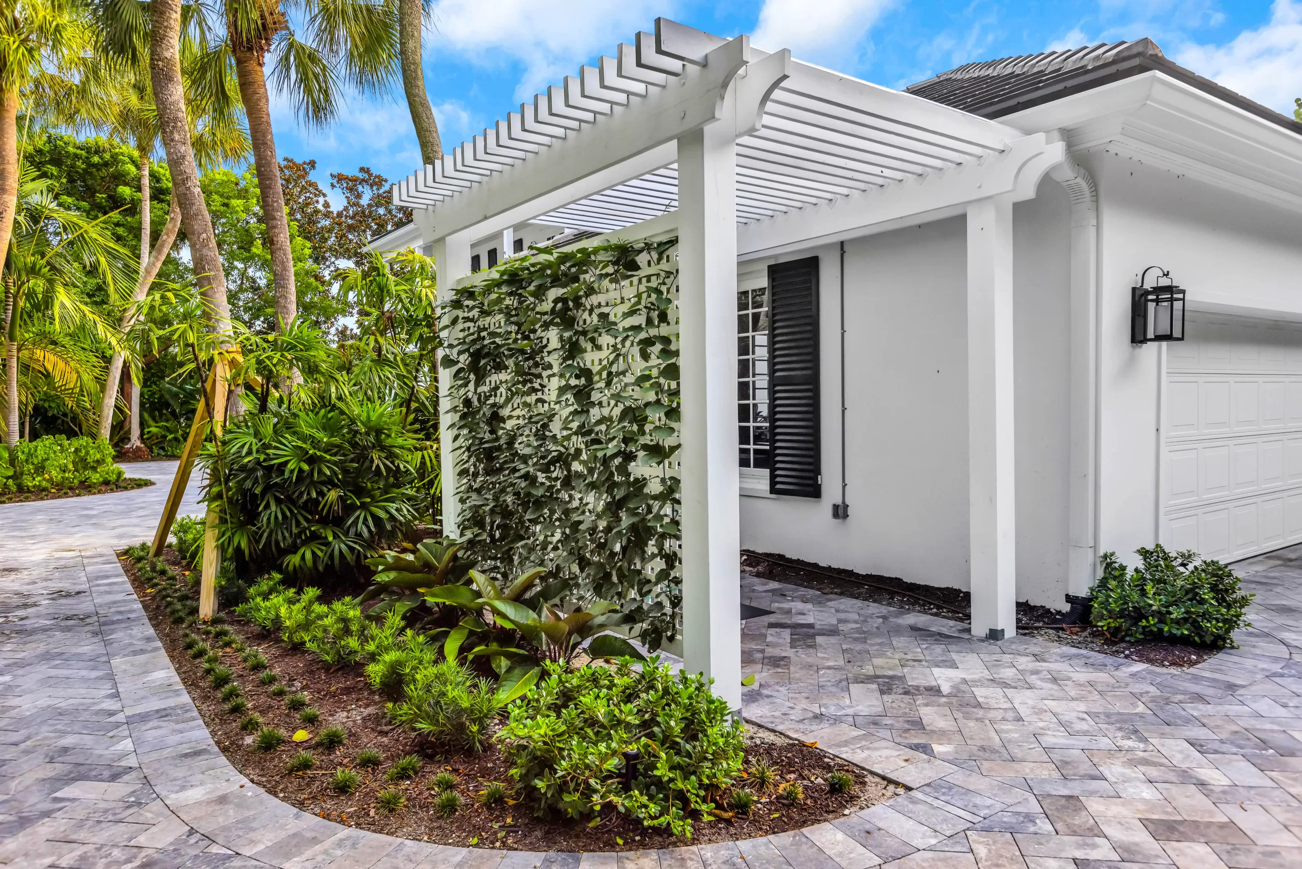 Along the sides of the home, we renewed the structure of the property by replacing aged arbors, gates, and fencing, bringing back the crispness of form. Each new arbor was planted with Confederate jasmine, adding fragrance and softness that naturally complement the architectural lines.