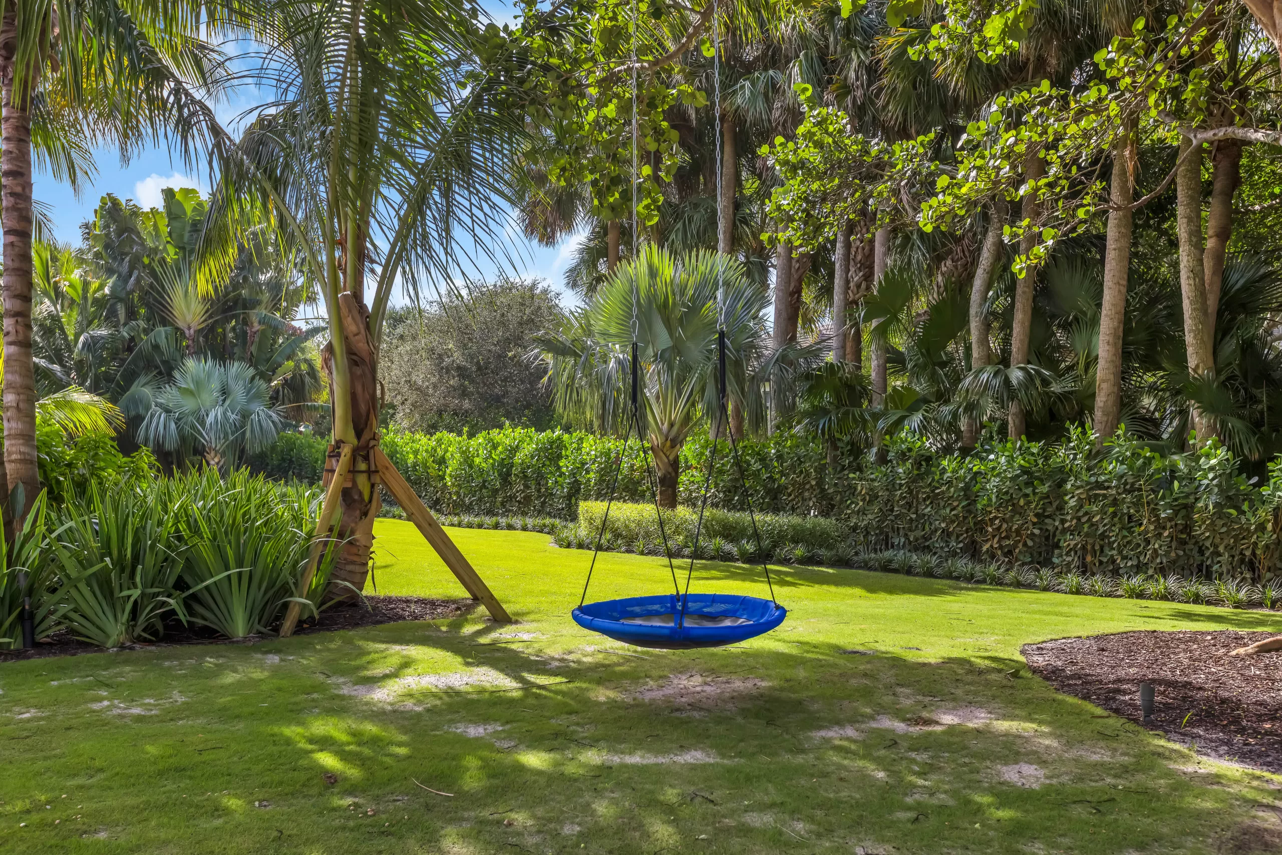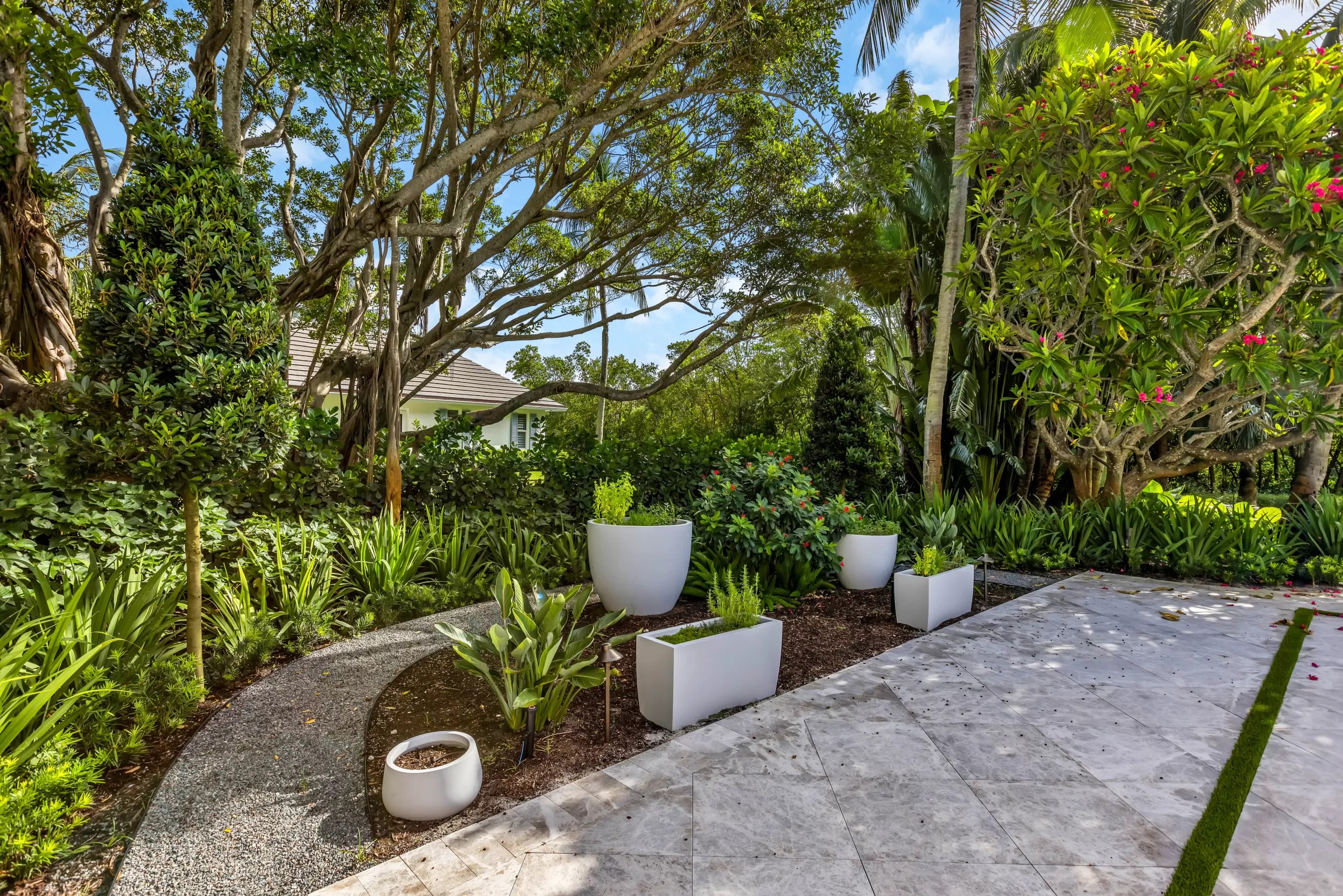As you approach the property, the curvilinear driveway gently winds toward a magnificent Banyan tree—a living centerpiece that grounds the design in both scale and character. We embraced its grandeur by creating a shade garden and walking path beneath its canopy, transforming it into a peaceful retreat for the family to enjoy.