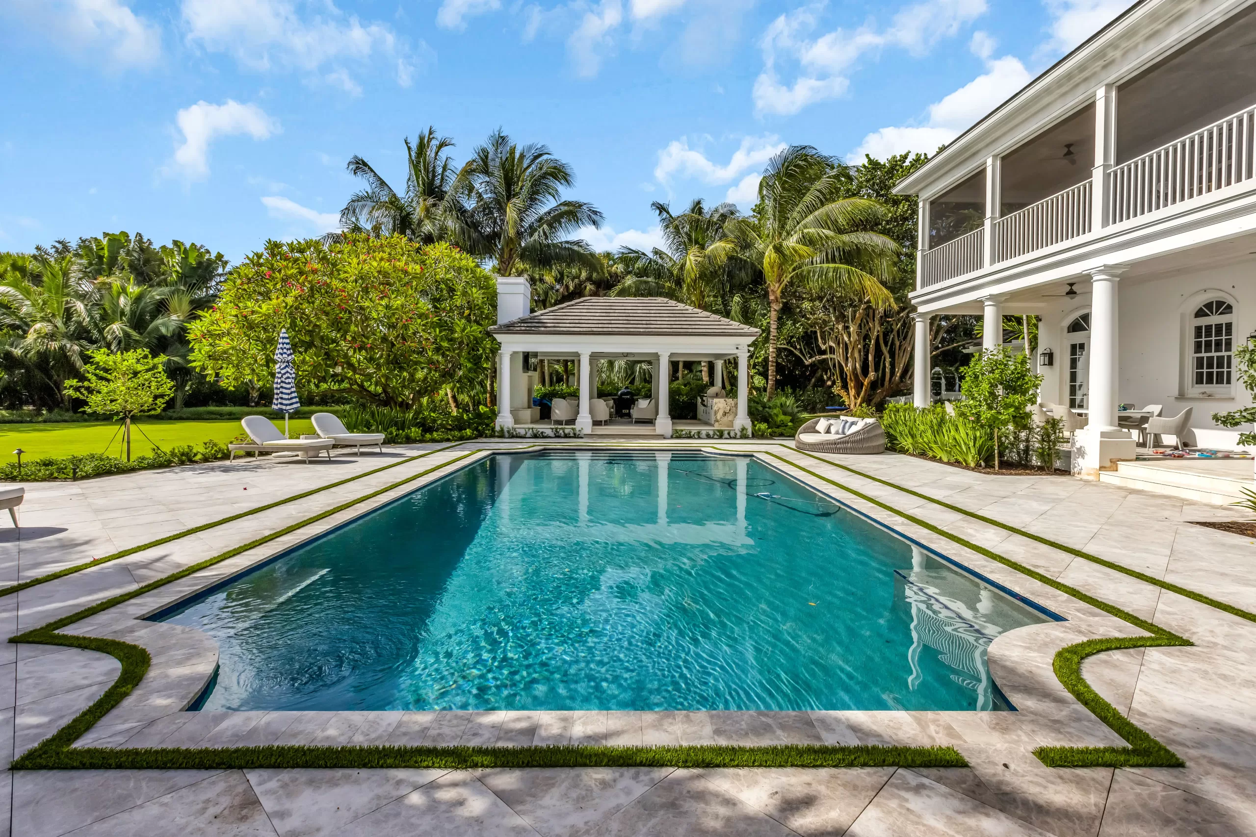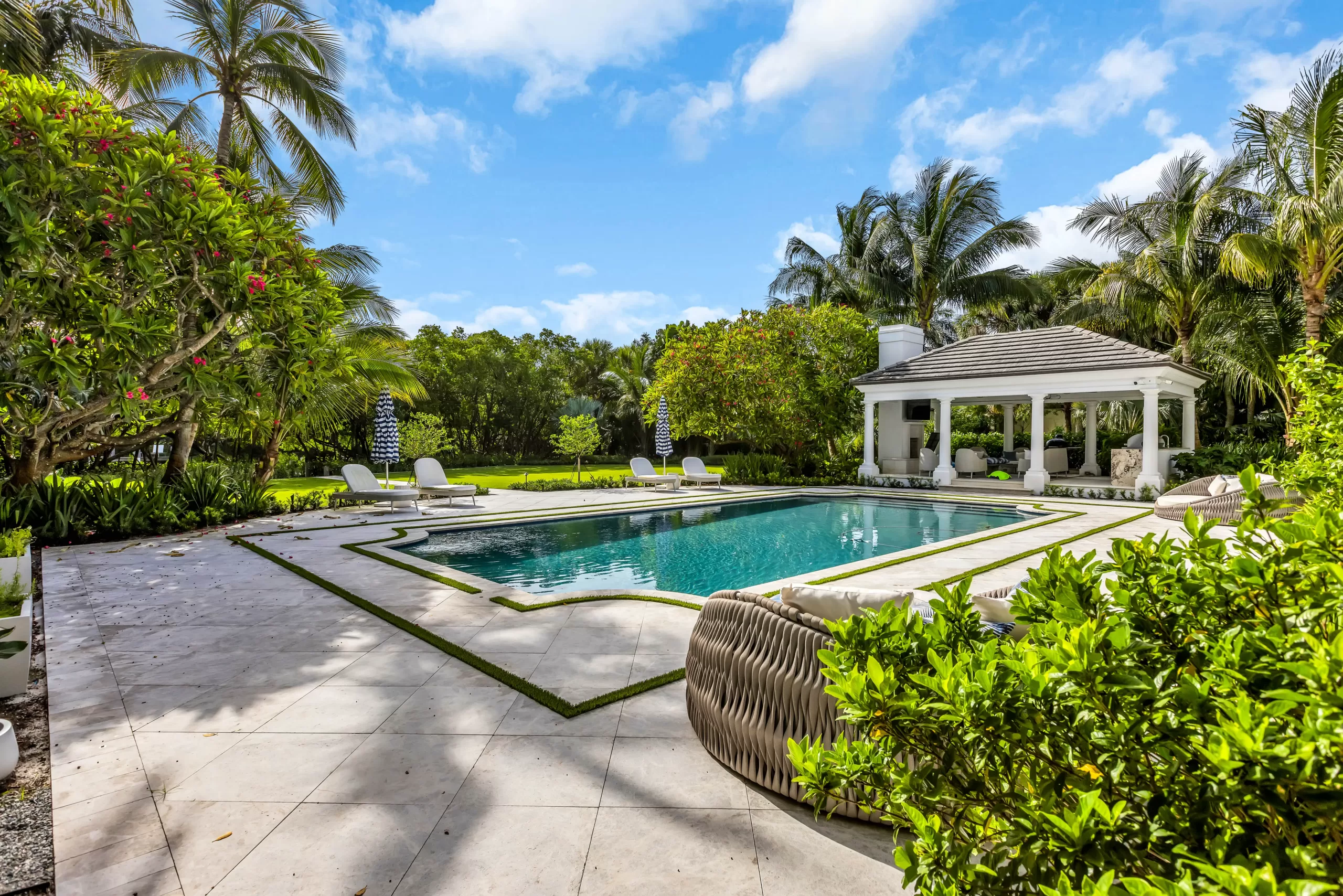 One of their main priorities was transforming the backyard into a more usable, family-friendly space. Frequent flooding from the rear tidal pond left much of the lawn soggy and unusable after storms. In addition to resolving these challenges, they wanted a cohesive design that complemented their home’s architecture—uniting classic formality with a relaxed, tropical sensibility perfect for family life.