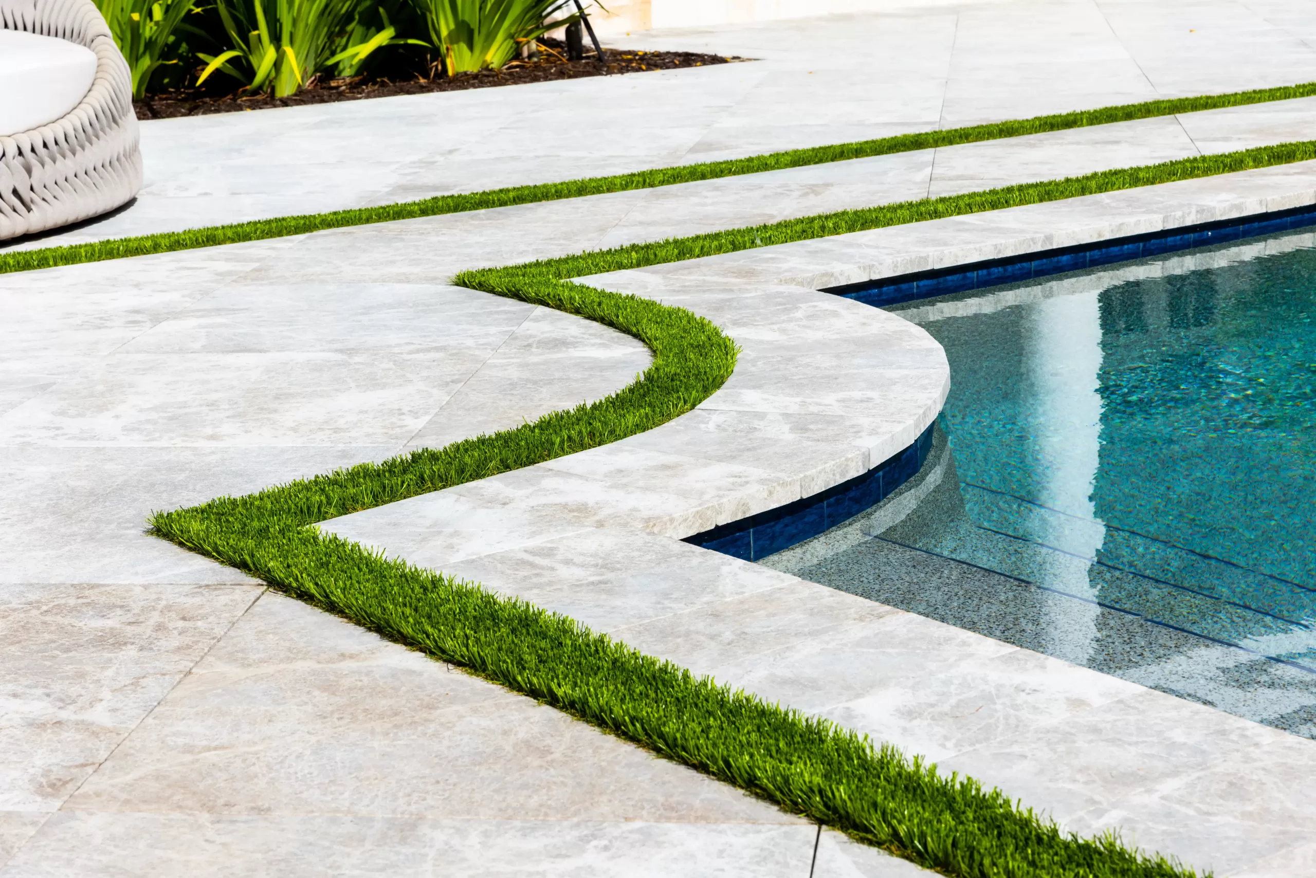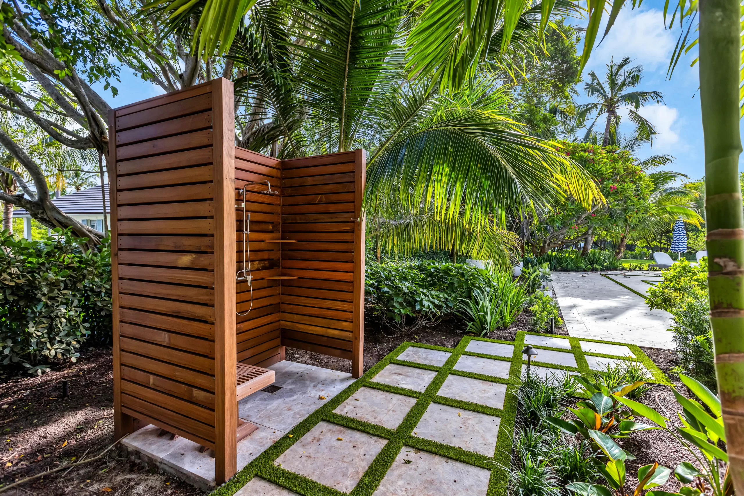 The pool deck design continues the architectural rhythm of the home, bordered with artificial turf strips that frame the classic pool shape with a clean, modern contrast. Adjacent to the pool, a custom Ipe wood outdoor shower was designed as both a statement feature and a practical luxury—perfect for rinsing off after a swim or an afternoon of play.