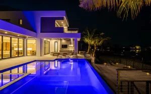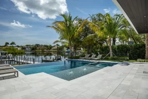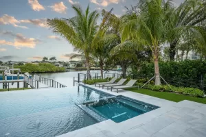 The custom-designed pool serves as the defining feature of the backyard. Designed around the home’s architectural footprint, rather than a central axis, it includes a sun shelf with bubblers and an integrated submerged spa—each oriented toward the Intracoastal for unobstructed views.
