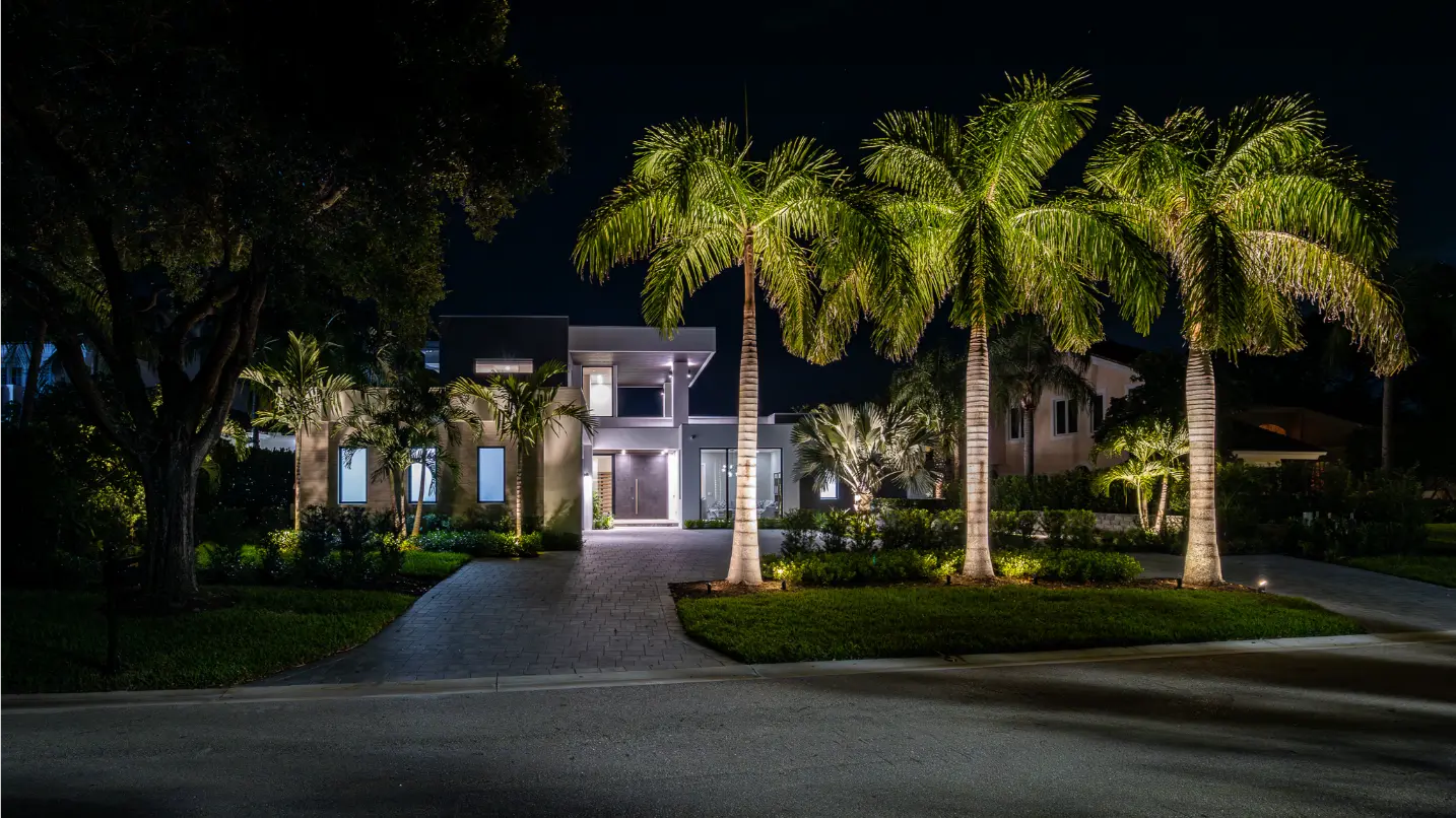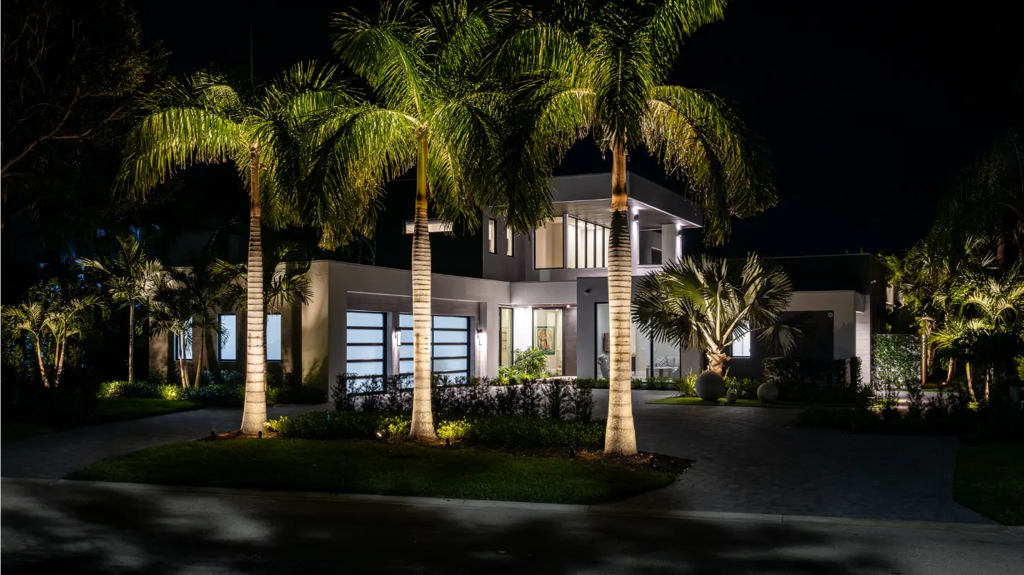 A minimalist lighting approach was implemented to complement the architecture’s restraint. Uplighting on coconut palms and low path lighting along walkways provide subtle glow and dimension at night, enhancing form and structure without competing with the home’s clean lines.
