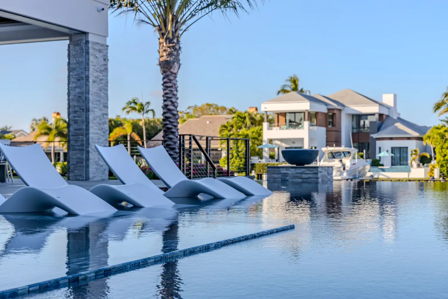 Every detail, from the framed palms at the entry to the waterfall and walk-over-water terrace, contributes to a sense of timeless harmony. Even within the property’s technical constraints, the design achieves clarity and rhythm—a perfect reflection of transitional elegance and thoughtful restraint.