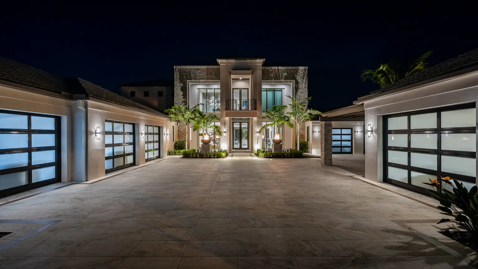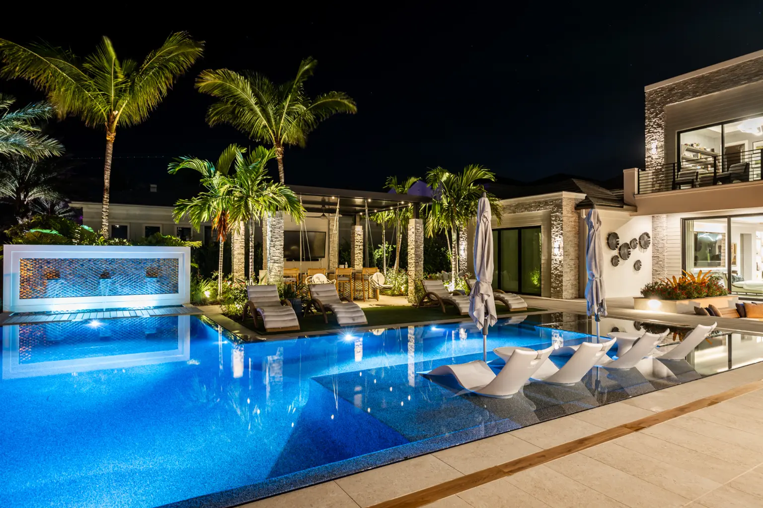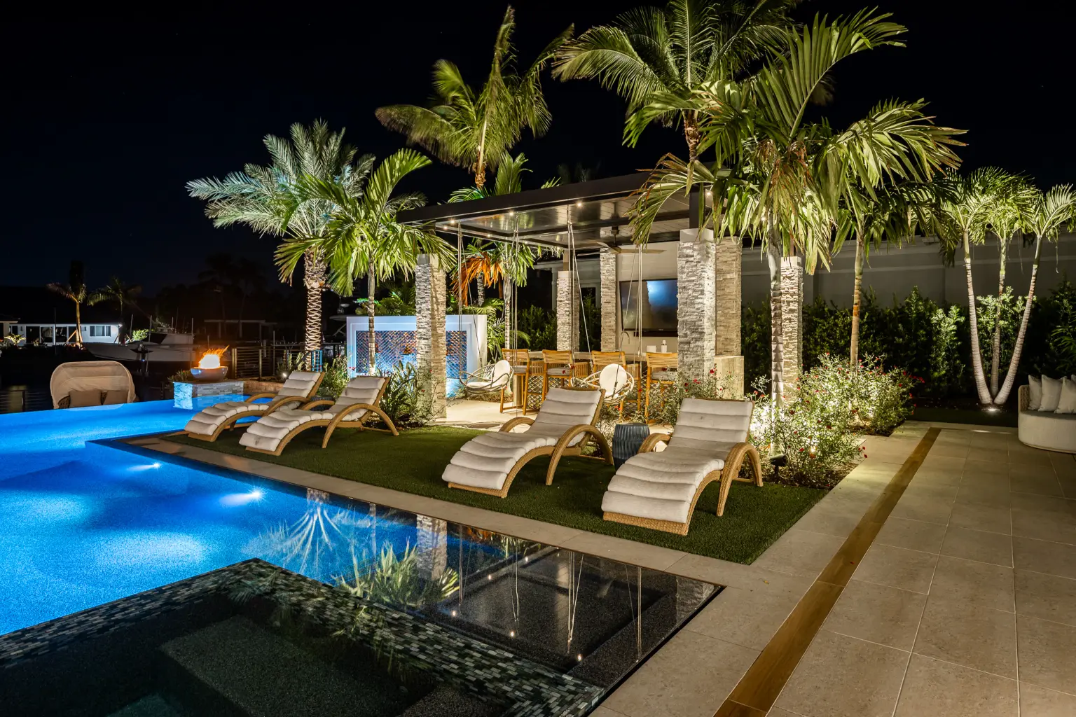 From the driveway’s porcelain glow to the pool’s underwater LED illumination, every light source was selected for precision and subtlety. The result is a unified, sophisticated glow that defines the property’s ambiance without overpowering it—light as an art form, designed for experience.