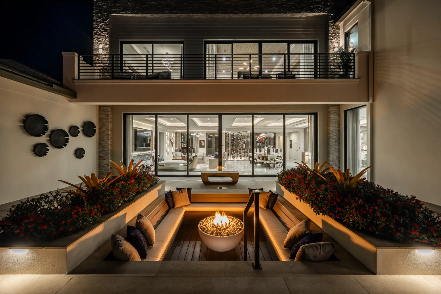 Fire and water serve as guiding elements throughout this design, carried from the front entry to the rear terrace. Sculptural fire bowls positioned near the entry mirror those placed at the pool’s infinity edge, establishing a visual rhythm and emotional connection between arrival and retreat.