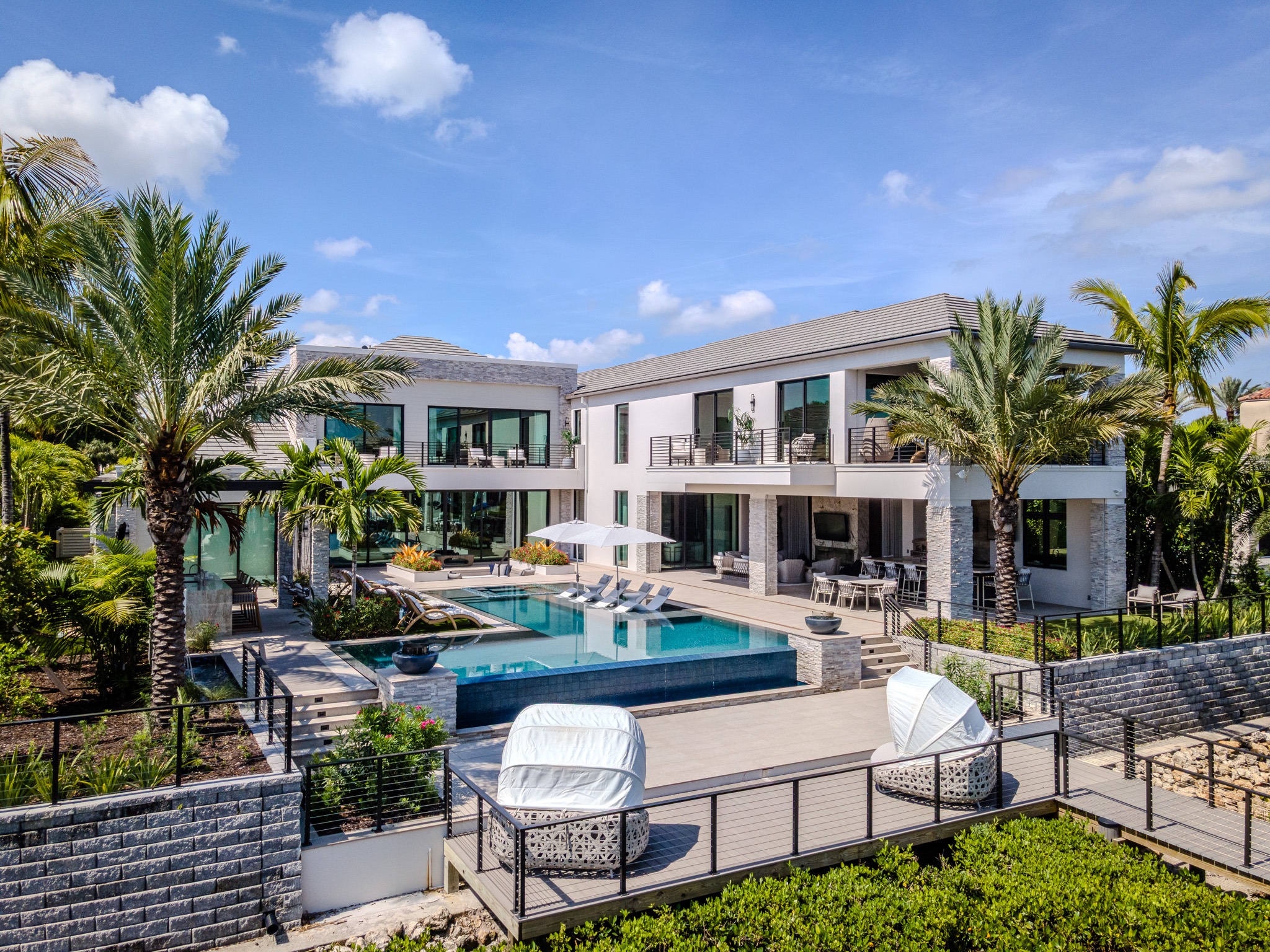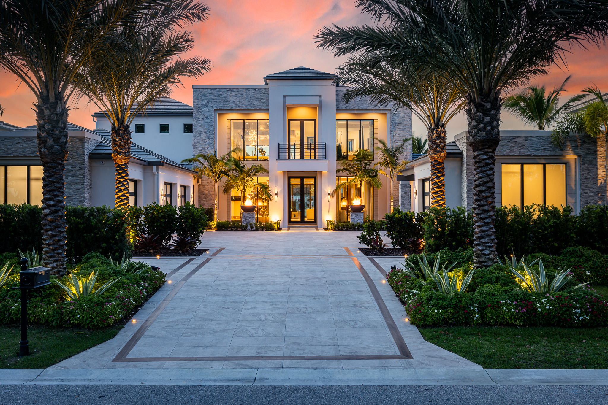 The interplay of symmetry, texture, and seasonal color gives the property its visual warmth—a classic Palm Beach sensibility expressed through modern restraint.