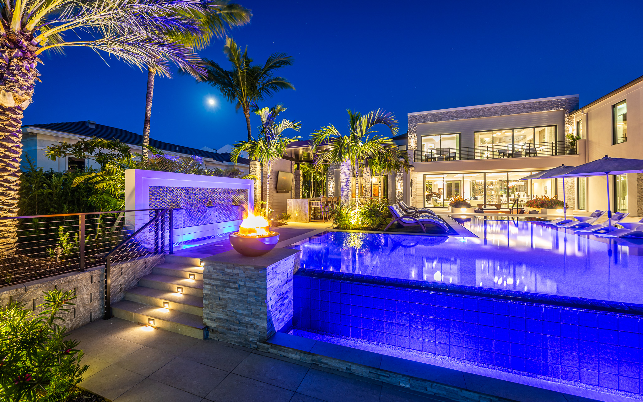 Lighting design played an essential role in shaping the property’s evening character. Recessed step lights, uplighting on palms, and subtle path lighting bring the architecture and landscape to life at night, enhancing texture and depth.
