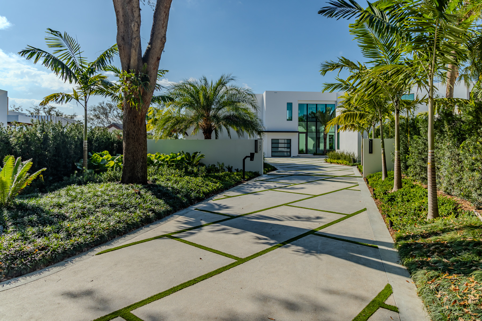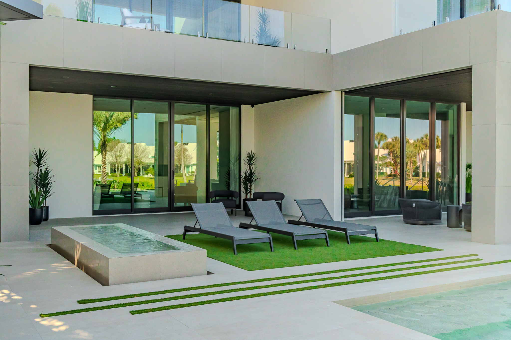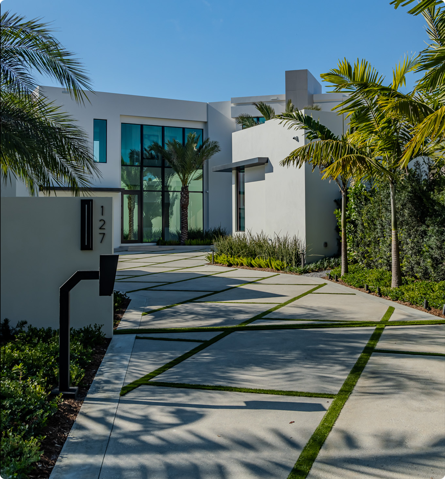 The driveway was constructed using poured concrete with a smooth architectural finish, paired with artificial turf joints that emphasize the property’s modern rhythm and angular orientation. These strong linear elements extend throughout the site, uniting the driveway, entry, and pool terrace in a continuous, cohesive language.