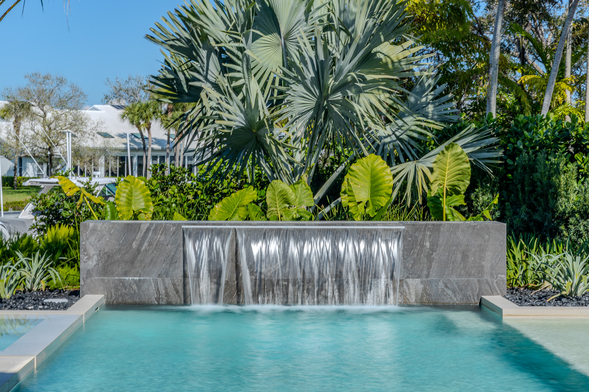 The porcelain paver deck continues the home’s sleek architectural language, while turf inlays add linear contrast and definition to the design. A sun shelf and submerged spa anchor one end, complemented by a custom fire feature and cascading water wall that bring energy and atmosphere to the outdoor living space. The composition is at once structured and fluid—a study in modern coastal balance.