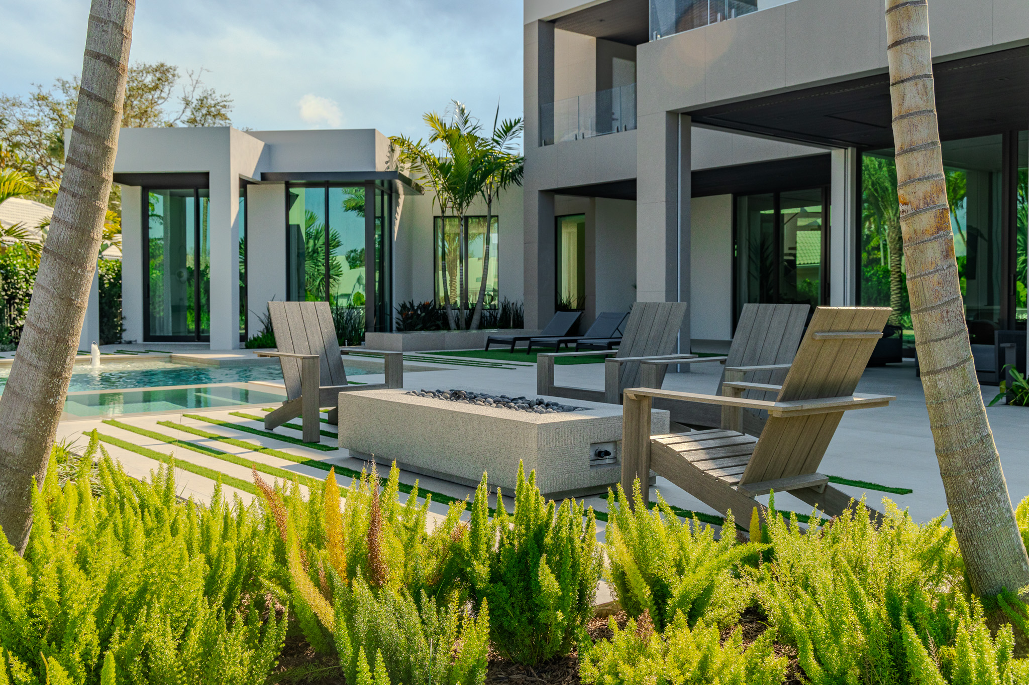 To soften the clean geometry, we layered low, textural plantings of Mondo grass, sculptural palms, and native accents. The result is a landscape that feels intentionally modern yet warm and inviting—lush at the ground plane, restrained in form, and deeply harmonious with the home’s contemporary design.