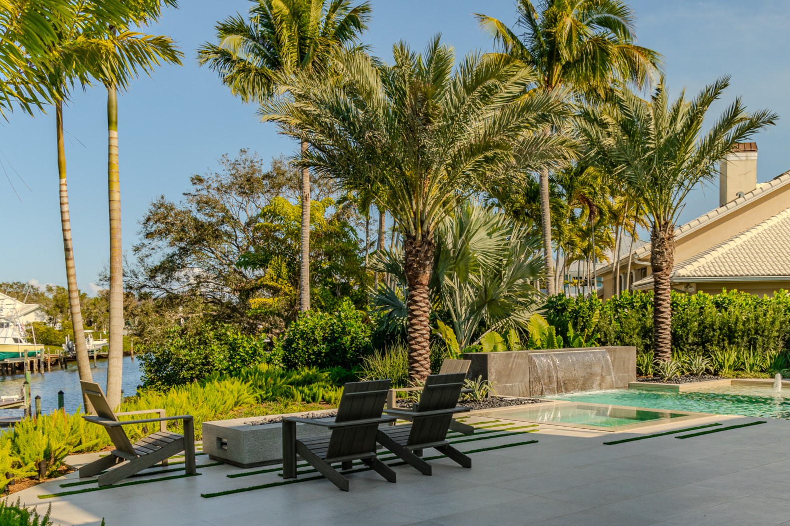 Terraced retaining walls address the site’s natural grade change, creating a smooth transition from the main living area to the pool and dock. The result is a sequence of outdoor rooms that feels effortlessly layered, connecting architecture, elevation, and water in one continuous experience.